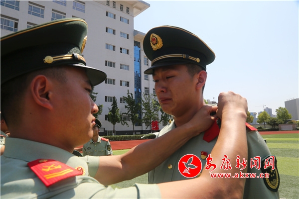 “我是中國人民武裝警察部隊(duì)軍人,我宣誓……”離隊(duì)前,武警安康支隊(duì)組織滿服役期士兵開展退役儀式。滿服役期老兵身披綬帶、胸戴紅花,最后一次站在軍旗前以軍人的身份,重溫誓詞、向軍旗敬禮。期間,留隊(duì)?wèi)?zhàn)友為滿服役期士兵卸下警銜、領(lǐng)花、帽徽和胸標(biāo),為他們戴上“光榮花”。“8年了 ,突然要離開,還真有點(diǎn)舍不得。”卸下肩章的那一刻,下士趙毅璞眼中泛起的淚花忍了又忍,終究還是沒能忍住。