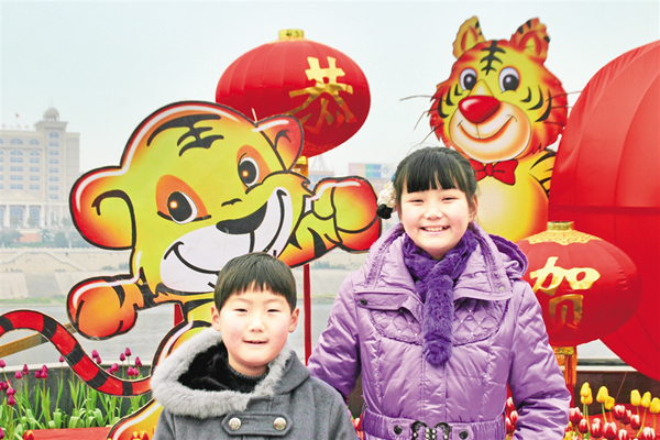 那些年每年春節,相關單位都會在安康城區重要的游玩場所布置生肖的卡通畫像等花燈。這兩個小朋友也要站在生肖“虎寶寶”前拍照留念(圖五)。預祝著來年“虎虎生威,虎年大吉……”