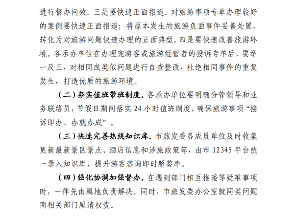 (二)夯實值班帶班制度。各承辦單位要明確分管領導和業務聯絡員,節假日期間落實24小時值班制度,確保旅游事項“接訴即辦、辦就辦成”。