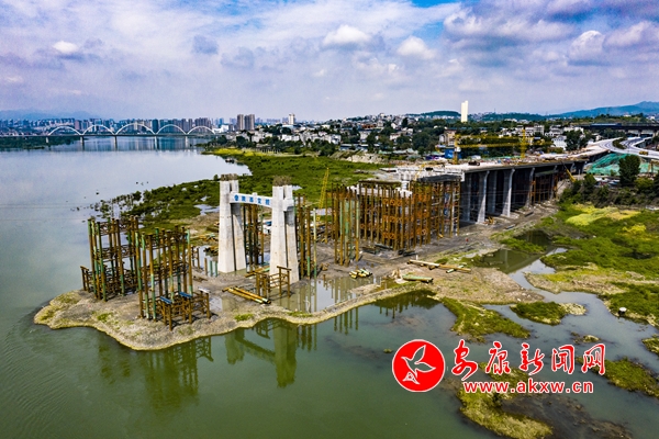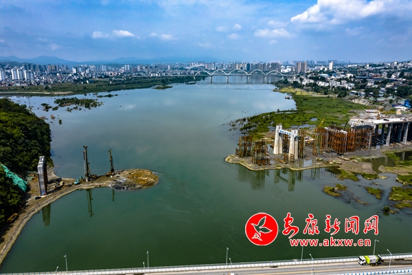 5月11日雨后初晴,安康新關廟漢江大橋建設正有序進行。據介紹,5月10日大橋主橋所有樁基完成混凝土灌筑,這也為大橋如期竣工奠定基礎。新關廟漢江大橋是“兩橋一路”控制性項目,也是我市“十四五”重大基礎設施建設項目,2023年民生實事票決項目之一。工程于2022年3月開工,計劃2026年3月通車,工期4年。(記者 潘潤生 攝)BxJ安康新聞網