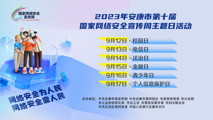 此次宣傳周由市委宣傳部、市委網信辦、市教體局、市公安局、市工信局、市總工會、共青團安康市委、市婦女聯合會、漢濱區委網信委和中國人民銀行安康市分行十部門聯合舉辦,精彩紛呈,不容錯過。
