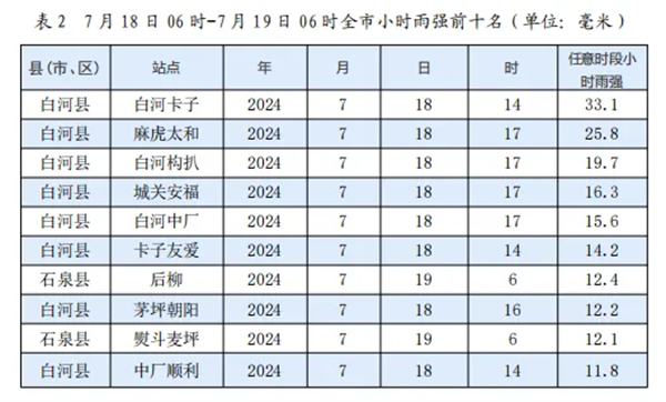 2024年7月18日白天我市大部出現陣雨天氣,19日05時起我市西部出現較強降水天氣。據統計,2024年7月18日06時至7月19日06時安康市平均雨量為6.1毫米,其中單站雨量最大為白河卡子氣象監測站48.4毫米,縣市平均雨量最大為白河縣15.3毫米,最大小時雨強出現在白河卡子氣象監測站33.1毫米(18日13時-14時)。全市共有235個站出現了降雨(大于0.1毫米),10毫米(中雨)以上有41站,25毫米(大雨)以上有8站。共有16站次小時雨強超過10毫米,2站次小時雨強超過20毫米。