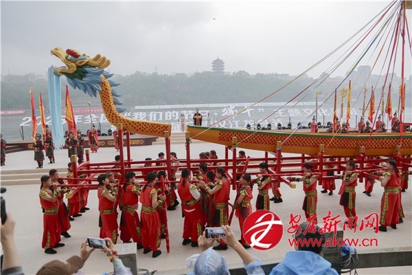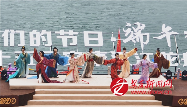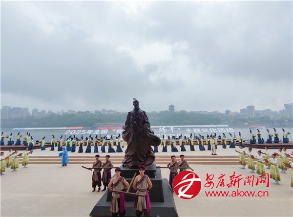 活動現場,6聲渾厚鐘聲劃破長空。“緬懷先賢……”隨著主祭官畫外音傳來,60名身著青綠漢服的女子手捧香粽菖蒲,踏古琴清音翩躚而出。屈原塑像被緩緩護送入舞臺中央,112名身著漢服的學童齊聲詠頌祭文的聲浪在江岸回蕩。隨著粽拋碧波,香囊、梔子花贈客,流淌千年的龍舟文化,化作平安順利、幸福安康的當代回響。