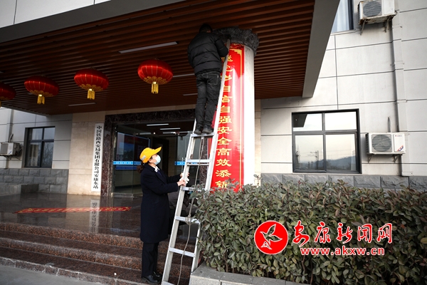 Wfj安康新聞網 圖為該站干部職工在機關樓下貼春聯Wfj安康新聞網