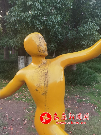 五一期間,安康高新區運動公園內,一處運動塑像遭人“抹黑”,污跡斑斑,有礙觀瞻。(記者 許安)