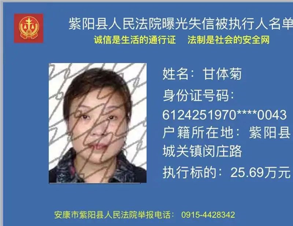 被執行人甘體菊,你因不履行(2017)陜0924民初241號民事判決書確定的義務,已被紫陽縣人民法院納入失信被執行人名單庫依法進行信用懲戒。信用懲戒范圍包括但不限于以下措施:MML安康新聞網