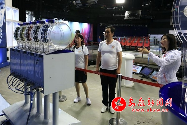 19時,安康觀摩團在工作人員的指導(dǎo)下,進行了嚴(yán)格有序的安檢工作。每個人都需要將隨身所帶物品全部放入存儲柜。所有人員安檢結(jié)束后,通過專用通道,憑實名認(rèn)證的通行證進入開獎直播大廳。待大家整齊落座開獎直播大廳后,工作人員再次講解注意事項,并邀請觀摩團收看了開獎場地介紹、開獎流程、數(shù)據(jù)封存及搖獎設(shè)備四個短視頻。工作人員還將試機球發(fā)給觀摩團成員,讓大家真實感受搖獎球的質(zhì)地,四名幸運站長被邀請到臺上零距離參觀搖獎設(shè)備。