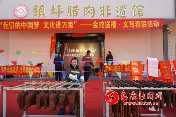 “喝口臘肉湯,給個皇帝都不當!”臘肉節(jié)準備了20個大吊鍋,把大鐵鍋燉的各種臘肉和各種炒菜美食擺成長桌宴,讓到場的嘉賓和群眾共同品嘗。鎮(zhèn)坪臘肉節(jié)不僅僅是一場臘肉美食的集會,更是一種非遺技藝的傳承。活動現(xiàn)場還邀請了陜南民歌傳唱人夏梅子為大家獻唱民歌,并舉辦了“追尋非遺味道”米花糖制作體驗活動和“傳承非遺技藝”拓印美好祝福活動,以及“金蛇送福 文化進萬家”義寫春聯(lián)等活動。