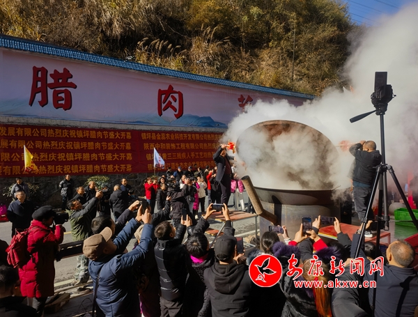 本網(wǎng)訊(記者 張喬) 灌香腸、熏臘肉,拓祝福、寫春聯(lián)……1月5日,“鎮(zhèn)坪縣臘肉節(jié)”拉開帷幕,一大早,陜西省省級非物質(zhì)文化遺產(chǎn)生產(chǎn)性保護示范基地“鎮(zhèn)坪臘肉腌制技藝”非遺工坊——鎮(zhèn)坪縣漢巴食品有限公司門前支起了巨型大鐵鍋,燉上了500斤的臘肉、臘排、臘豬蹄和香菇、竹筍、干洋芋等輔料。