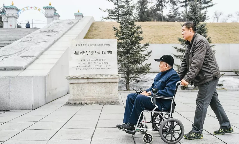 徐振明是吉林省通化市革命烈士陵園管理所首任所長,現年96歲。他先后參加過抗日戰爭、解放戰爭,1950年參加抗美援朝戰爭,曾榮立多次戰功。他退伍轉業到楊靖宇烈士陵園工作,父子兩代默默守護英雄陵墓60余年,身體力行保護革命遺跡,講述英雄故事,弘揚革命精神。圖為徐振明(左)和兒子徐永軍來到楊靖宇烈士陵園。 新華社記者 王昊飛/攝