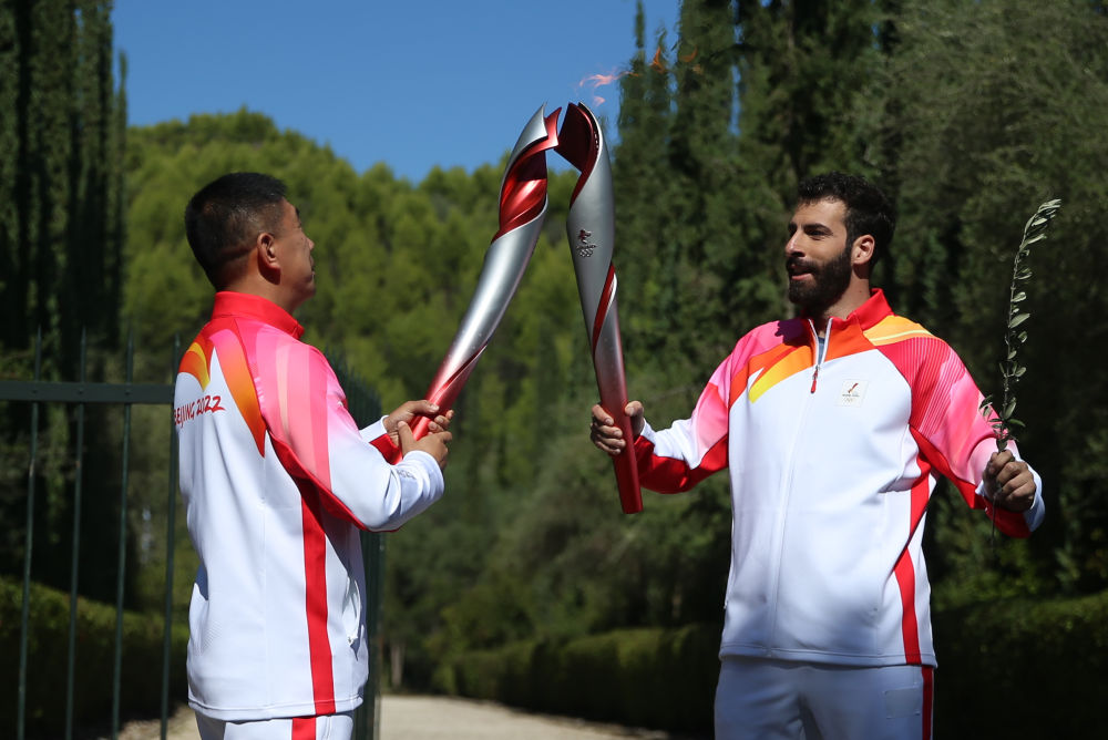 10月18日,希臘高山滑雪運動員揚尼斯·安東尼烏(右)將火種傳遞給第二名火炬手——前中國短道速滑運動員李佳軍。新華社記者 鄭煥松 攝
