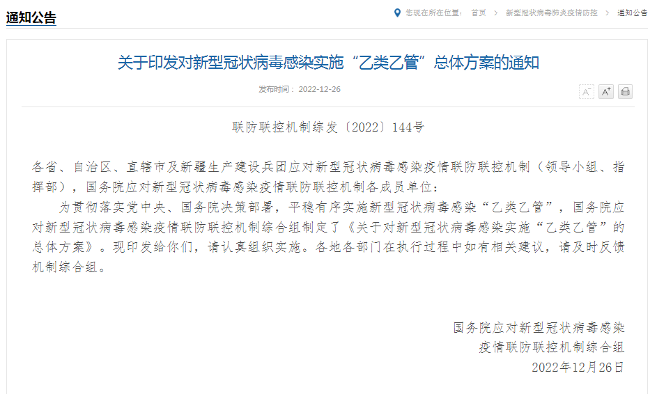 關(guān)于印發(fā)對新型冠狀病毒感染實施“乙類乙管”總體方案的通知