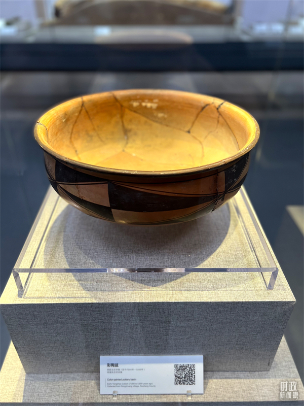 △運城博物館內展出的仰韶文化早期的彩陶盆。(總臺央視記者邢彬拍攝)