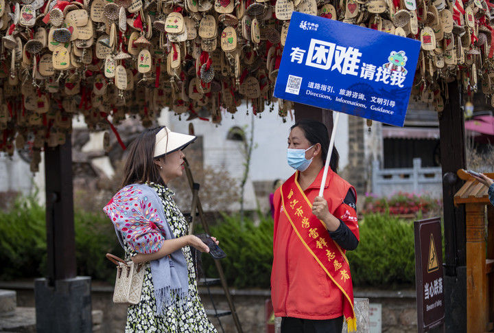 2023年5月18日,一名游客(左)在麗江古城向志愿者咨詢。2015年12月,云南麗江古城保護管理局牽頭成立了麗江古城旅游志愿者服務隊,志愿者主要來自市區機關單位、古城保護管理局、古城經營戶、在校學生、社區居民等,常年在古城內提供旅游咨詢、道路指引、文明引導等志愿服務。