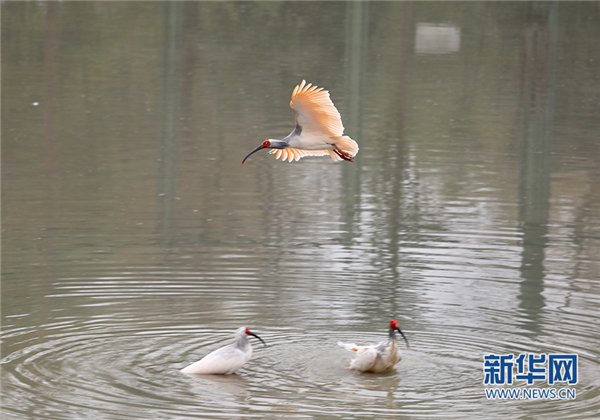 陜西洋縣朱鹮生態園內的朱鹮。新華網 汪艷攝