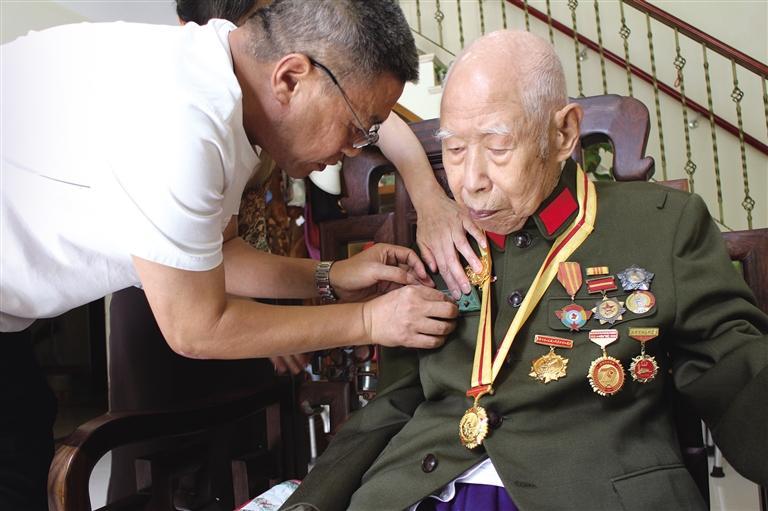 8月22日,99歲的我省抗戰老戰士劉炳榮佩戴國家頒發的“中國人民抗日戰爭勝利80周年”紀念章。 本報通訊員 吳寬宏攝5HQ安康新聞網