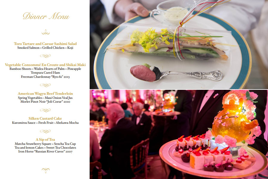 2015年4月28日,美國總統奧巴馬在白宮宴請日本首相安倍晉三,數百名賓客享用融合美日兩國特色的美食。國宴菜品在傳統西餐搭配的基礎上加入了日本元素,包括生魚片、和牛牛排、日本麻糬等,還有用白宮菜園里摘取的蔬菜所制成的沙拉,用豆腐和豆奶制成的奶酪蛋糕,以及白宮廚師特別用糖制作的櫻花茶壺。