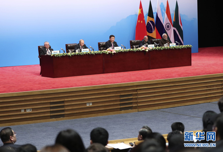 9月4日,國家主席習近平在廈門出席金磚國家領導人同工商理事會對話會并發表講話,巴西總統特梅爾、俄羅斯總統普京、印度總理莫迪、南非總統祖馬共同出席。新華社記者 丁林 攝