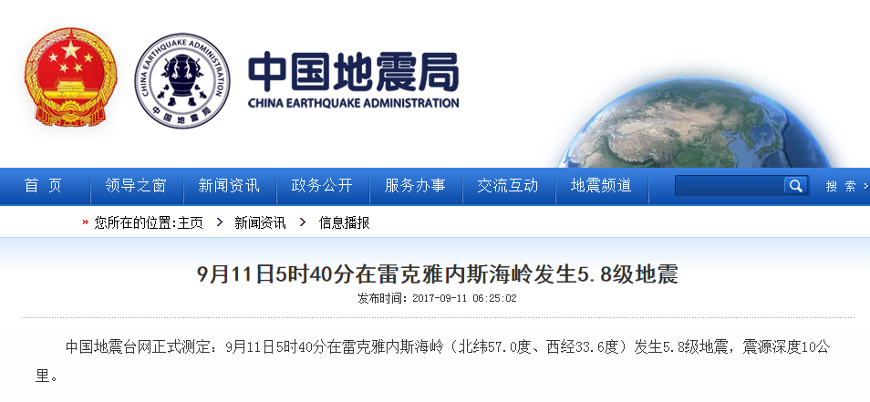 北大西洋雷克雅內斯海嶺發生5.8級地震 震源深度10公里