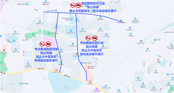 1、花園大道(安康大道至世紀(jì)大道)、世紀(jì)大道(新路口環(huán)島至五路口環(huán)島)、高新四路,所有通行車輛于6月6日21時至6月8日21時,無論遇到何種情況,一律禁止鳴笛,禁止大中型貨車、危化品運輸車通行。