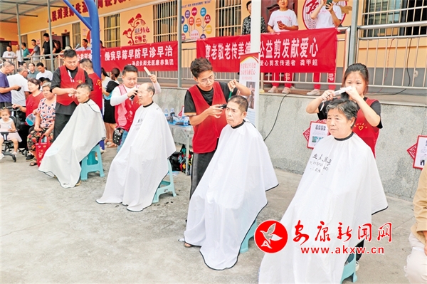 現(xiàn)場,通過有獎(jiǎng)問答、發(fā)放宣傳資料、設(shè)立咨詢臺(tái)等形式,向村民進(jìn)行平安建設(shè)、普法、反詐等宣傳。來自漢濱區(qū)陽光愛心護(hù)理院的志愿者們?yōu)槔先藗兲峁┙】抵笇?dǎo)。愛心人士龔甲超組織的義剪活動(dòng)也受到了老人們的歡迎,志愿者們免費(fèi)為現(xiàn)場50多名老人理發(fā)。書法家們現(xiàn)場圍繞“孝義”主題進(jìn)行創(chuàng)作,并贈(zèng)送給群眾。演出結(jié)束后,近百名老人到社區(qū)的孝義食堂參觀和免費(fèi)用餐。