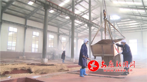 在漢陰縣雙乳鎮(zhèn)三同村頤品莊園酒廠標準化廠房車間里,工人們來回穿梭,在各自崗位上抓生產、趕進度。釀酒車間里,新出爐的酒糟熱氣騰騰,工人們快速將其攤晾,冷卻后又開始揮鏟拌曲,進入下一輪的裝窖發(fā)酵;蒸鍋旁,工人鉚足干勁,一層一層均勻加料上甑,熟練地進行各項工序。