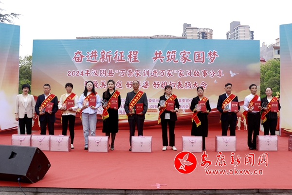 本網訊(通訊員 賀珍珍 熊樂 張欣欣)為進一步弘揚家訓文化,傳承優良家風,5月9日,由漢陰縣紀委監委、縣委宣傳部主辦,漢陰縣婦聯、縣文聯承辦的“奮進新征程 共筑中國夢”——“萬條家訓進萬家”家風故事分享暨最美家庭、好婆婆、好媳婦表揚大會在漢陰縣鳳凰廣場舉行。CVd安康新聞網