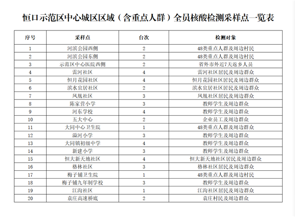 共設(shè)置20個采樣點(diǎn)、53個采樣臺(見附件),由相關(guān)責(zé)任單位統(tǒng)一負(fù)責(zé)采樣點(diǎn)設(shè)置、人員組織、秩序維護(hù),檢測對象按現(xiàn)場工作人員要求,有序到指定地點(diǎn)進(jìn)行采樣,避免人員聚集。
