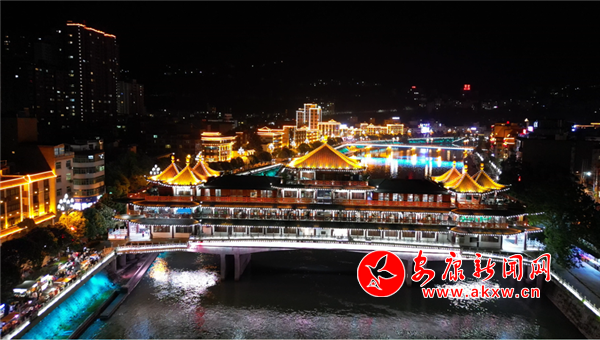 華燈初上,從露營基地回到縣城,大街上人來人往熱鬧非凡。位于縣城中心的河街美食街散發著濃濃的煙火氣,各色美食吸引了不少游客前來打卡。沿著河濱休閑步道漫步,兩岸燈光將嵐河渲染得絢麗多彩,橫跨嵐河之上的廊橋也在夜色中散發著迷人的光影。