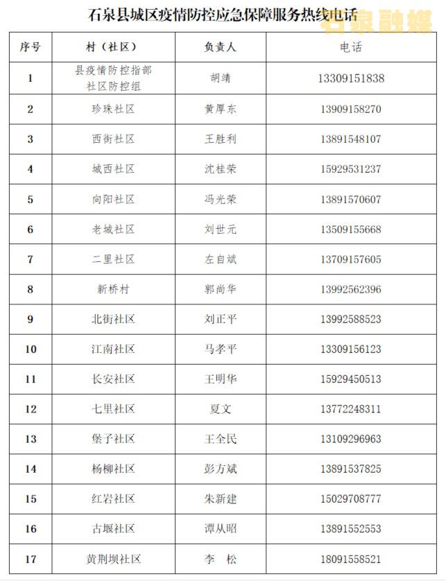 為保障市民生活,滿足群眾生活需求,現(xiàn)公布石泉縣城區(qū)應(yīng)急保障服務(wù)熱線電話,歡迎大家咨詢反映問題,我們將認(rèn)真對待,快速反應(yīng),抓緊解決,最大限度降低防控期間給您生活帶來的影響。9yT安康新聞網(wǎng)