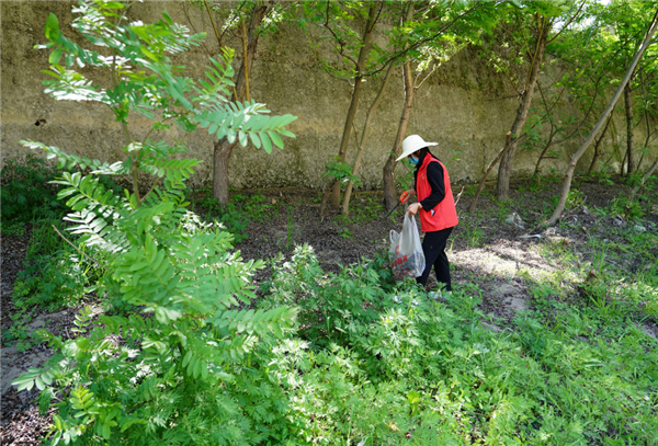 4月10日,在陜西旬陽(yáng)市雙河鎮(zhèn)高坪社區(qū)河道旁,女子志愿護(hù)河隊(duì)隊(duì)員撿拾完垃圾后離開(kāi)。 新華社記者 邵瑞 攝