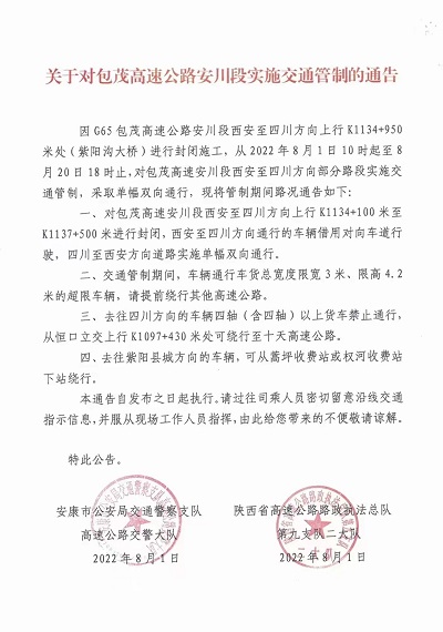 即日起至8月20日 包茂高速公路安川段實施交通管制