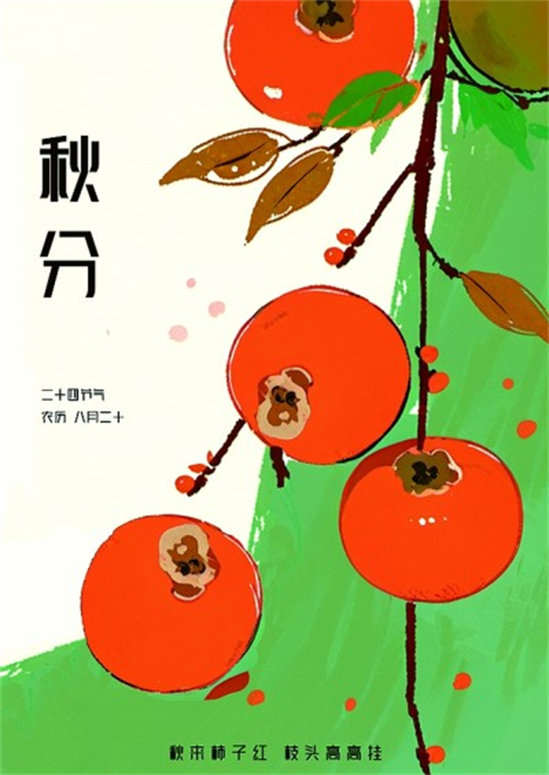 秋分到,柿子紅。柿子又稱“朱果”,立秋之后的柿子更加甜美可口。圖①作品取柿子的吉祥寓意,刻畫了一幅秋柿高掛枝頭的場景,成熟的柿子飽滿而有光澤,看起來非常吸引人。圖②則以“秋分吃石榴”為主題展開創作,將俯視的石榴與切開的石榴圖形化,通過形狀的大小對比以及色塊的明度變化,增加了海報的視覺層次感和前后縱深感,使單一元素變得豐富;在色彩選擇上,通過暗紅色與淡黃色的對比,帶來了比較跳躍的視覺體驗。vHh安康新聞網