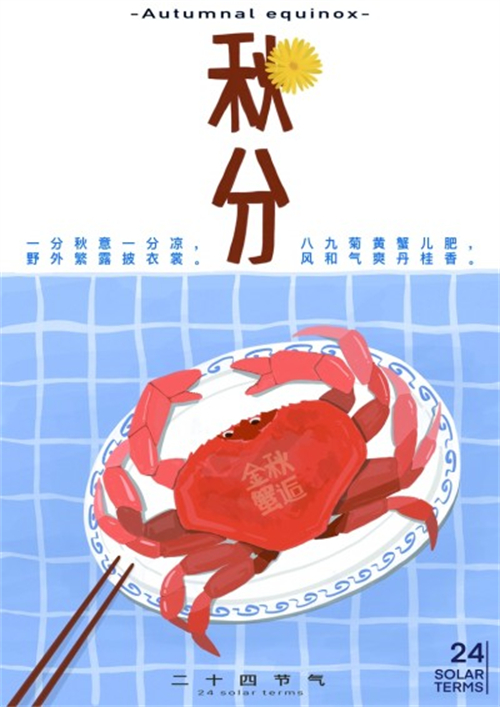 “秋風起,蟹腳癢,菊花開,聞蟹來。”把酒持螯,真可謂一件樂事。圖⑥畫面中央的大閘蟹紅艷誘人,寓意豐收與團圓;白色盤子與藍色格子桌布相映成趣,增添節日溫馨感;黃色的菊花與“秋分”字樣相襯,融合了中國傳統元素與現代審美,傳遞出濃厚的秋分節氣氛圍。vHh安康新聞網