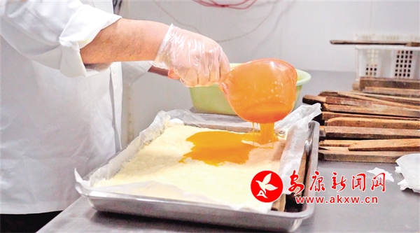 白河肉糕的選材極為講究,以七分肥三分瘦的優質豬肉、雞蛋、淀粉等為主要原材料,輔以蔥姜等天然香辛料。將豬肉放在展板上用木槌搗成泥后加水攪拌均勻,再與蛋清、淀粉等按比例調和。隨后把蘿卜切成條塊,在蒸籠里擺成長方形模具狀,填入搗好的肉泥,蒸上十分鐘;待初定型后,去籠,往肉糕上均勻涂抹蛋黃,每蒸五分鐘涂抹一次;三次過后,正宗的肉糕就做成了。