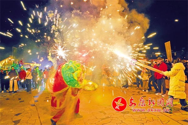夜幕降臨,在中壩作坊小鎮廣場上,音樂響起,熊熊篝火燃燒,伴隨著動感的音樂,游客與居民們手牽手,肩并肩,圍著篝火載歌載舞。而最吸引人的還是舞火龍、火獅子表演,在璀璨煙火中,火龍飛舞盤旋,火獅子搖頭晃腦,騰挪跳躍,威風八面,現場不少游客噴起煙花,花燒得越旺、鑼鼓聲越急,獅子舞得也越歡快,大家共同享受著這場精彩紛呈的非遺文化盛宴。Jgu安康新聞網